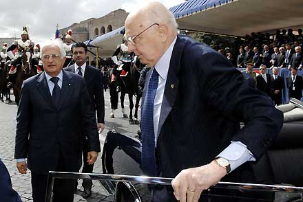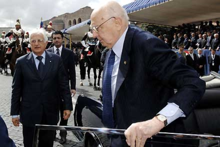 Il Presidente Giorgio Napolitano, nella foto con il Segretario Generale del Quirinale Donato Marra, in via dei Fori Imperiali per la Parata militare, in occasione della Festa della Repubblica