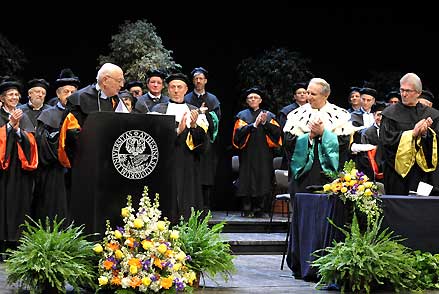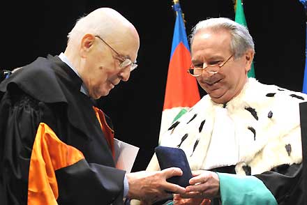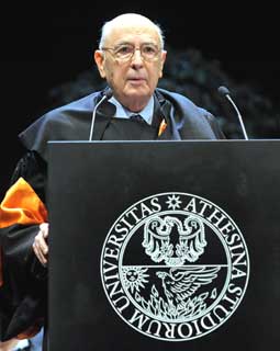 Il Presidente Giorgio Napolitano con il Rettore dell'Università degli Studi di Trento durante la cerimonia di conferimento del titolo di Professore Onorario