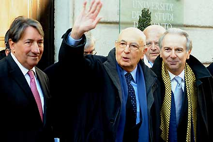 Il Presidente Giorgio Napolitano con Innocenzo Cipolletta e Davide Bassi, rispettivamente Presidente e Rettore dell'Università degli Studi di Trento all'uscita dalla sede del Rettorato
