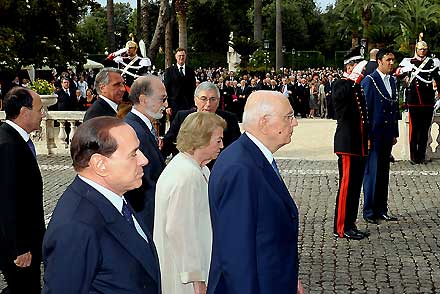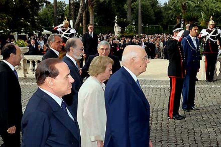 Il Presidente Giorgio Napolitano accompagnato dalla moglie Clio, nella foto con il Presidente del Consiglio Silvio Berlusconi e dal Presidente della Corte Costituzionale Franco Bile, durante il ricevimento nei giardini del Quirinale