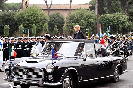Il Presidente Giorgio Napolitano mentre passa in rassegna le formazioni schierate per la rivista militare