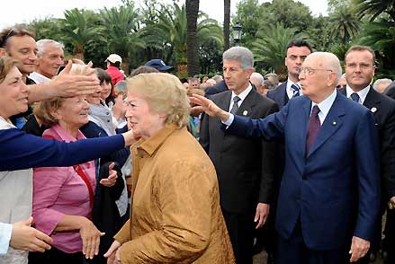 Il Presidente Giorgio Napolitano e la Signora Clio tra la gente in occasione dell'apertura dei Giardini del Quirinale per la Festa Nazionale della Repubblica