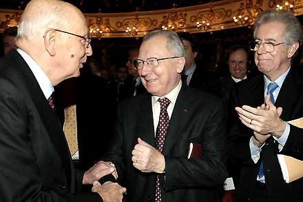 Il Presidente Giorgio Napolitano con Jacques Delors e Mario Monti al Teatro Regio, in occasione dell'inaugurazione dell'Anno di Corso del 2008-2009 del Diploma Avanzato in Studi Europei