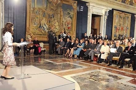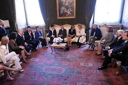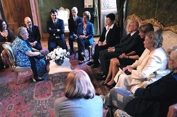 Il Presidente Giorgio Napolitano si intrattiene con alcuni dei familiari delle vittime del terrorismo al termine della celebrazione del Giorno della Memoria. Nella foto il Capo dello Stato siede accanto alle vedove Pinelli e Calabresi