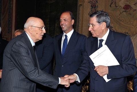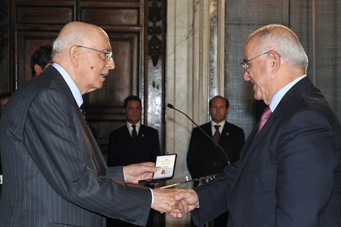 Il Presidente Giorgio Napolitano consegna ai componenti uscenti del Consiglio Superiore della Magistratura una medaglia ricordo. Nella foto con Vincenzo Carbone