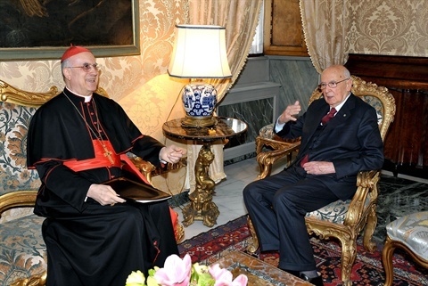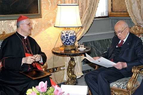Il Presidente Giorgio Napolitano con S.Em.Cardinale Tarcisio Bertone, Segretario di Stato della Santa Sede in occasione della consegna del messaggio di Sua Santità Benedetto XVI per il 150° anniversario dell'Unità d'Italia