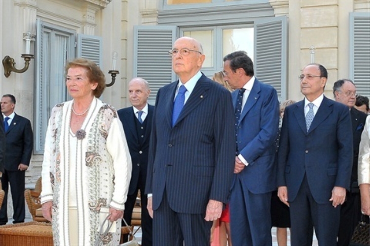 Il Presidente Giorgio Napolitano durante l'Inno Nazionale eseguito dalla Banda della Guardia di Finanza in occasione del ricevimento per la Festa Nazionale della Repubblica