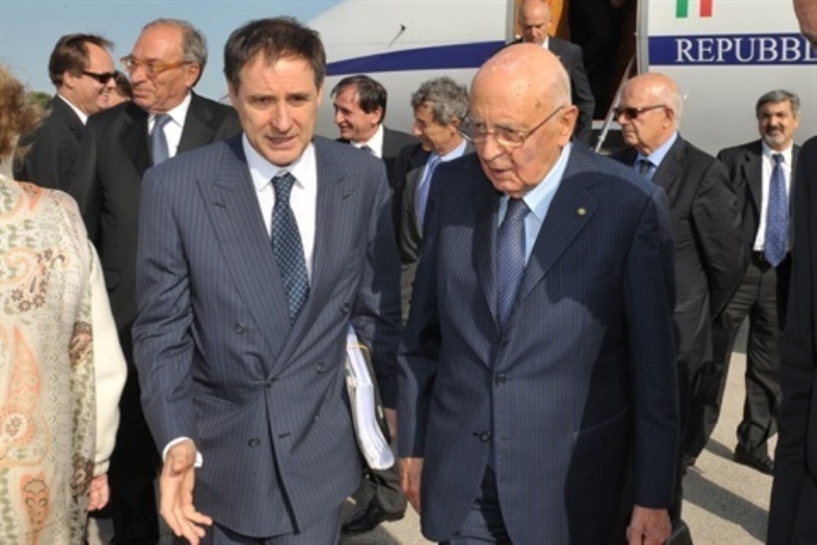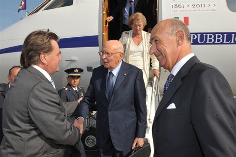Il Presidente Giorgio Napolitano con l'Ambasciatore d'Italia a Zagabria Alessandro Pignatti Morano di Custoza al suo arrivo a Pola