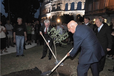 Il Presidente Giorgio Napolitano e il Presidente della Croazia nel corso della posa simbolica di un albero di olivo dinanzi all'Arena