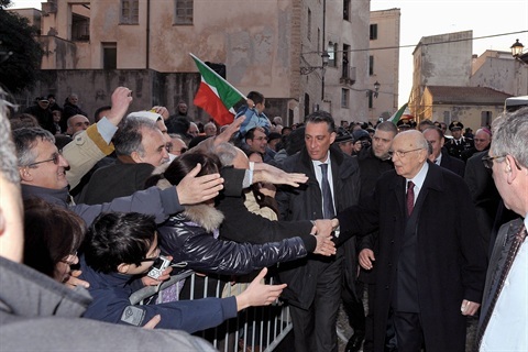 Il Presidente Giorgio Napolitano risponde alle domande dei giornalisti al suo arrivo al Teatro Lirico di Cagliari