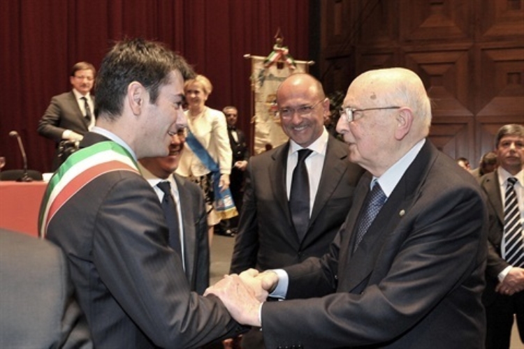 Il Presidente Giorgio Napolitano al termine del suo intervento al Teatro Lirico saluta il Sindaco