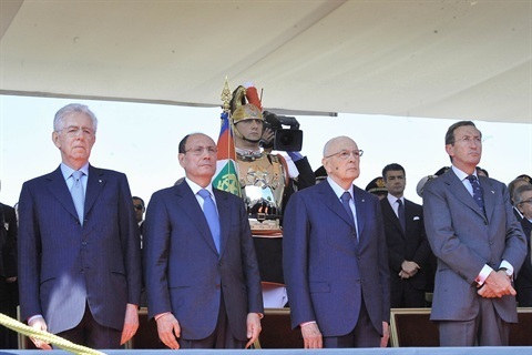 Il Presidente Giorgio Napolitano al suo arrivo all'Altare della Patria saluta il Presidente del Senato Renato Schifani, il Presidente della Camera Gianfranco Fini, il Presidente del Consiglio Mario Monti e il Presidente della Corte Costituzionale Alfonso Quaranta