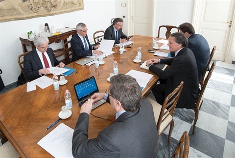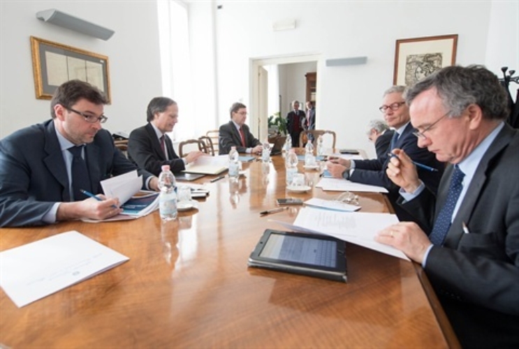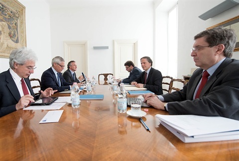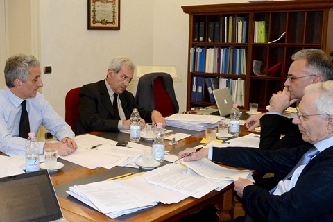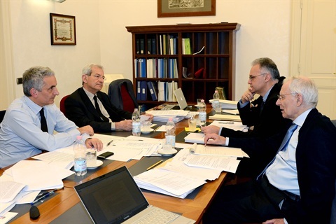 Il gruppo di lavoro in materia economico-sociale ed europea nel corso della prima riunione in una delle sale di studio presso l’Archivio Storico nel Palazzo Sant’Andrea, da sinistra Salvatore Rossi, Giovanni Pitruzzella, Filippo Bubbico, Giancarlo Giorgetti, Enzo Moavero Milanesi e Enrico Giovannini