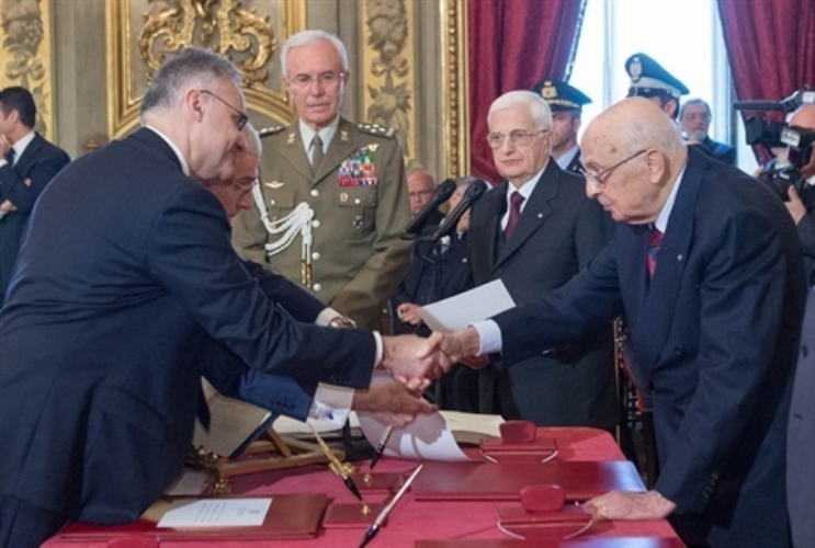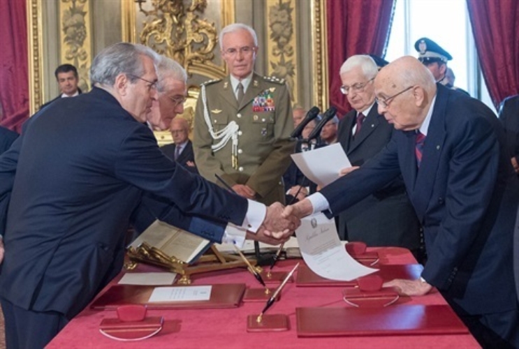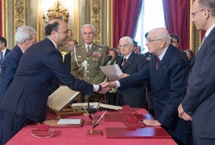 Il Presidente Giorgio Napolitano durante il giuramento di Angelino Alfano, Vice Presidente del Consiglio dei Ministri e Ministro dell'Interno del Governo Letta