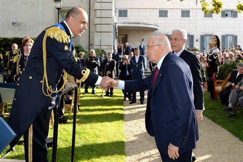 Il Presidente Giorgio Napolitano al termine del concerto eseguito dalla Banda della Marina Militare saluta il maestro in occasione dell'apertura al pubblico dei Giardini del Quirinale per la Festa Nazionale della Repubblica,
