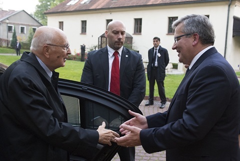 Il Presidente Giorgio Napolitano accolto dal Presidente della Polonia Bronislaw Komorowski al suo arrivo a Villa Decius