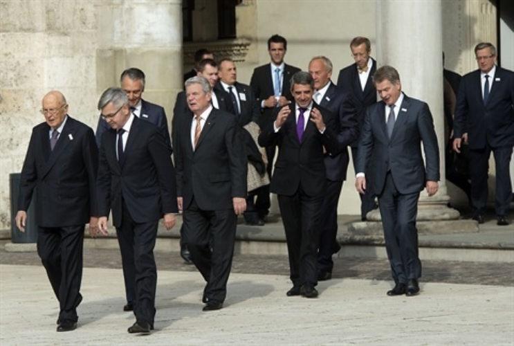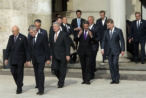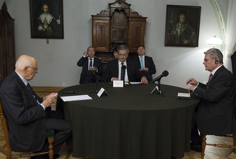 Il Presidente Giorgio Napolitano con il Presidenete della Repubblica Federale di Germania Joachim Gauck e il Presidente di Polonia Bronisław Komorowski, al termine del vertice Informale Multilaterale di Capi di Stato "Uniti per l'Europa"