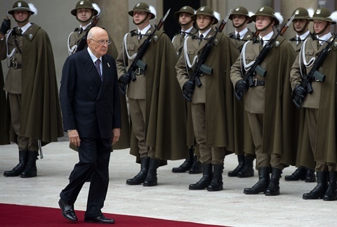Il Presidente Giorgio Napolitano saluta i giornalisti al suo rientro in albergo dopo una breve passeggiata nel centro città