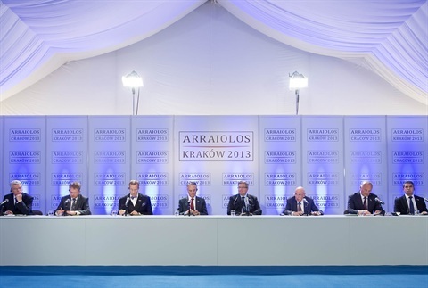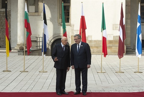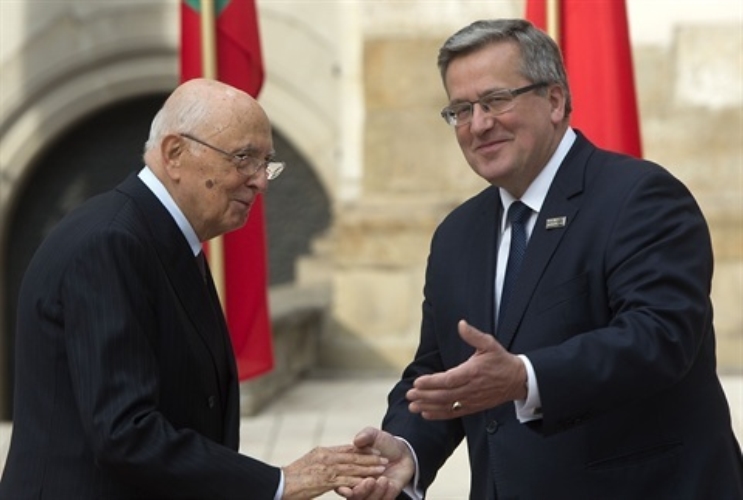 Il Presidente Giorgio Napolitano accolto dal Presidente di Polonia Bronislaw Komorowski al suo arrivo al Castello di Wawel, in occasione dell'Incontro Informale Multilaterale di Capi di Stato "Uniti per l'Europa"