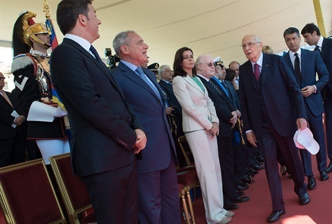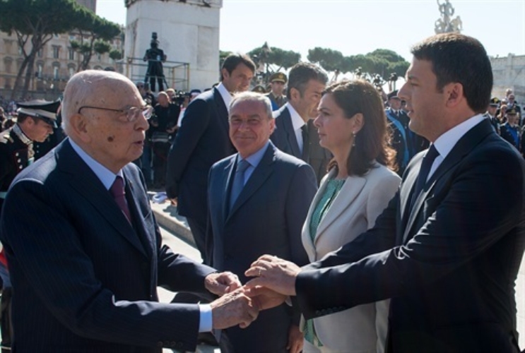 Il Presidente Giorgio Napolitano al suo arrivo a Piazza Venezia saluta Matteo Renzi, Presidente del Consiglio e le più Alte Cariche dello Stato