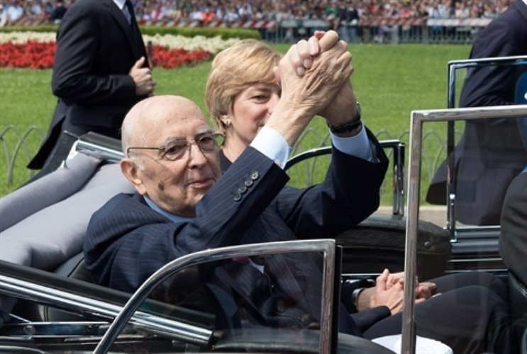 Il Presidente Giorgio Napolitano con a fianco il Ministro della Difesa Roberta Pinotti risponde al saluto dei cittadini, in occasione della Festa Nazionale della Repubblica