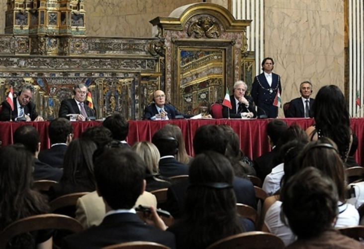 Un momento dell'incontro con i giovani durante le comunicazioni alla stampa, al termine del Vertice Informale Multilaterale dei Capi di Stato "Uniti per l'Europa"