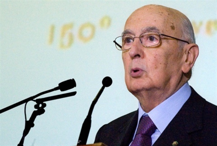 Il Presidente Giorgio Napolitano durante il suo intervento alla cerimonia a bordo della Portaerei Garibaldi per il 150° anniversario della "Partenza dei Mille"