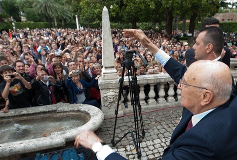 Il Presidente Giorgio Napolitano risponde al saluto dei cittadini che sono intervenuti all'apertura dei giardini del Quirinale, in occasione della Festa della Repubblica