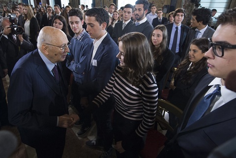 Il Presidente Giorgio Napoltiano saluta i ragazzi che hanno partecipato alla Conferenza "L'Europa dei diritti"