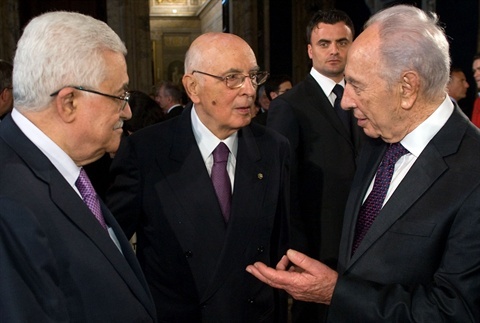 Il Presidente della Repubblica Giorgio Napolitano con Shimon Peres Presidente d'Israele e Mahmoud Abbas, Presidente dell'Autortià Nazionale Palestinese