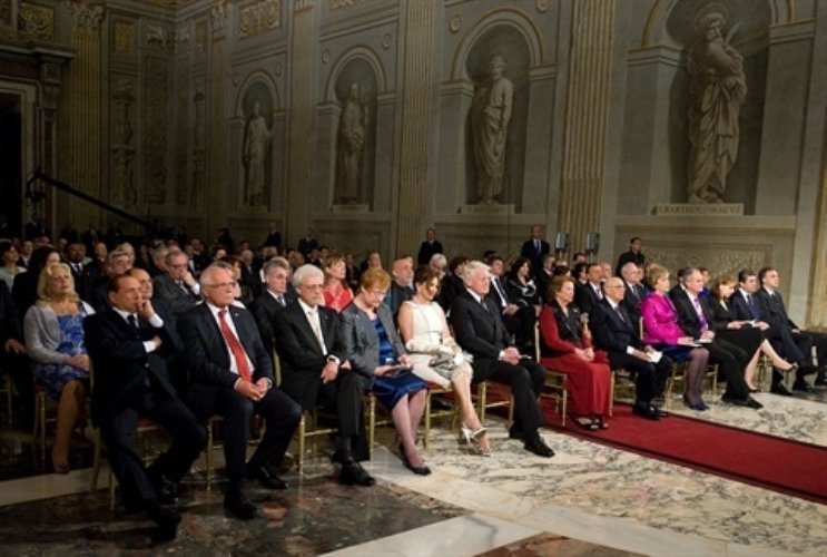 Il Presidente della Repubblica Giorgio Napolitano in occasione del concerto al Quirinale per la Festa della Repubblica, alla presenza dei Capi Delegazioni Ufficiali convenuti a Roma per le celebrazioni del 150° anniversario dell'Unità d'Italia