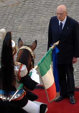 Il Presidente Giorgio Napolitano passa in rassegna un reparto di interforze, al suo arrivo, in occasione dell'insediamento.