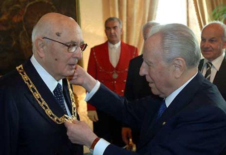 Il Presidente Giorgio Napolitano riceve dal Presidente Carlo Azeglio Ciampi le insegne di Cavaliere di Gran Croce decorato di Gran Cordone dell'OMRI.