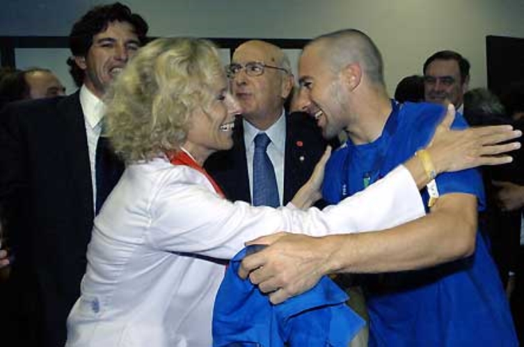 Il Presidente Giorgio Napolitano con Demetrio Albertini, il Ministro Melandri e Alessandro Del Piero, festeggiano la vittoria del Mondiale