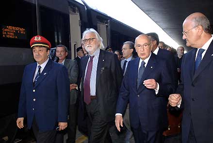 Il Presidente Giorgio Napolitano, nella foto con il Ministro dei Trasporti Alessandro Bianchi ed il Presidente e Amministratore Delegato delle FF.SS Elio Catania, poco prima della partenza per Firenze.