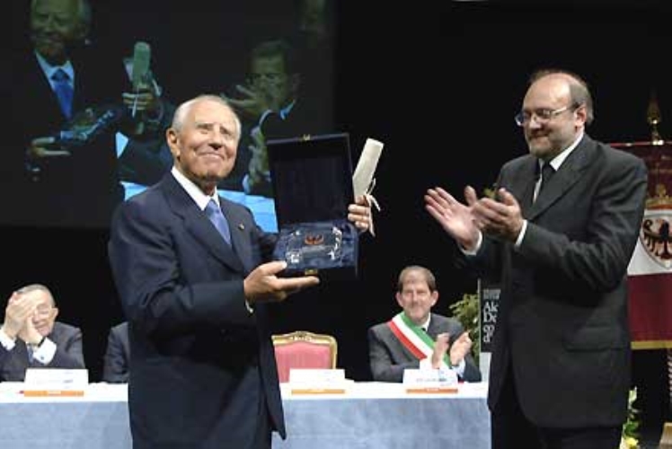 Il Presidente Emerito della Repubblica Carlo Azeglio Ciampi con il Premio Alcide De Gasperi consegnatogli dal Presidente della Provincia Autonoma di Trento Lorenzo Dellai
