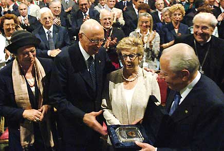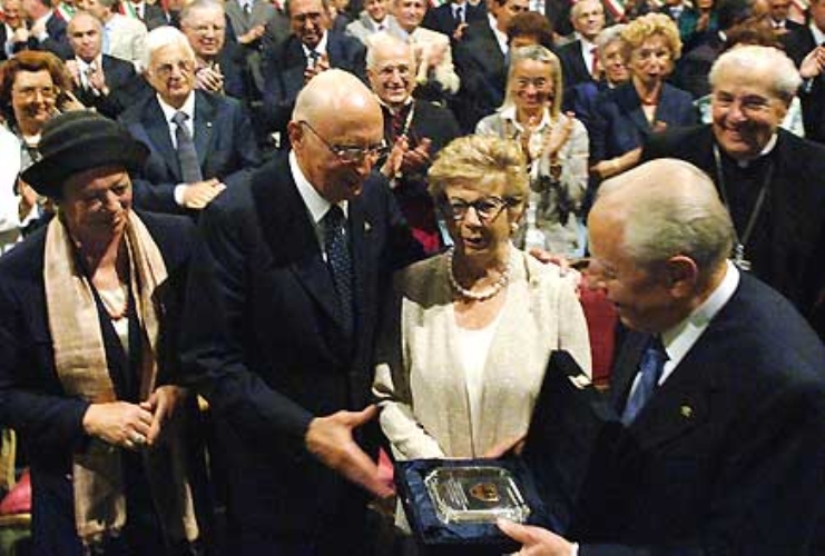 Il Presidente Giorgio Napolitano, a fianco la moglie Clio e la Signora Franca Ciampi, si congratula con il Presidente Emerito della Repubblica Carlo Azeglio Ciampi per il conferimento del Premio Alcide De Gasperi