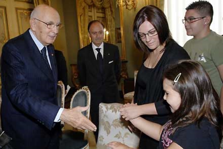 Il Presidente Girogio Napolitano con la vedova Parisi, Argentini Margherita ed i figli Chiara e Giovanni durante l'incontro in Prefettura