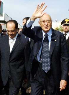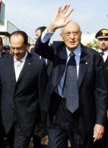 Il Presidente Giorgio Napolitano, a fianco il Ministro delle Politiche Agricole Paolo Di Castro, risponde al saluto dei cittadini al suo arrivo in Fiera
