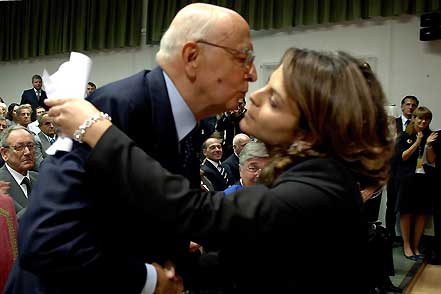 Il Presidente Giorgio Napolitano abbraccia la giovane libanese Roula Khadra al termine dell'indirizzo di saluto, della ricercatrice, nella sede dell'Istituto Agronomico Mediterraneo
