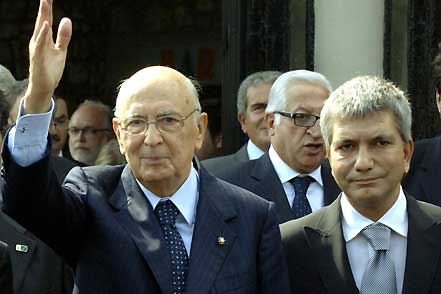 Il Presidente Giorgio Napolitano, a fianco Nichi Vendola, Presidente della Regione Puglia, risponde al saluto dei cittadini all'uscita dalla sede della Fiera