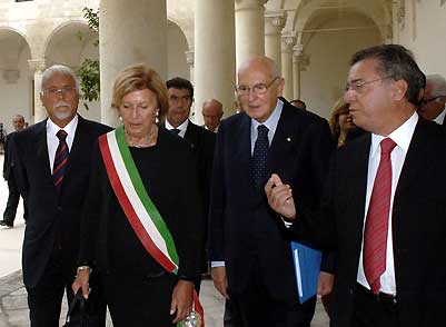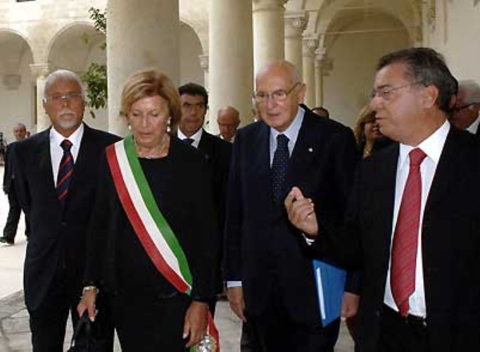 Il Presidente Giorgio Napolitano con il Sindaco Poli Bortone, il Rettore dell'Università Oronzo Limone ed il Sen. Maritati, al suo arrivo nella sede dell'Università.