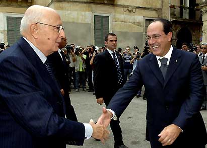 Il Presidente Giorgio Napolitano, salutato dal Ministro delle Politiche Agricole e Forestali Paolo De Castro, al suo arrivo in città.