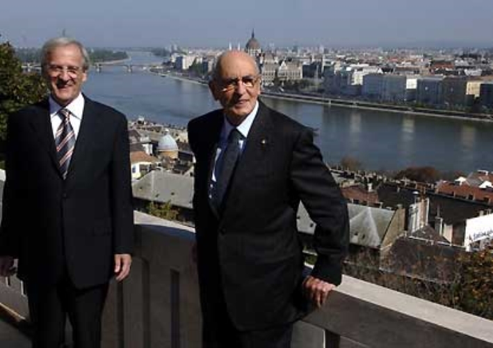 Il Presidente Giorgio Napolitano con il Presidente della Repubblica Ungherese Lazlò Sòlyom, poco prima dell'inizio dei coloqui, sul fondo il panorama della città.