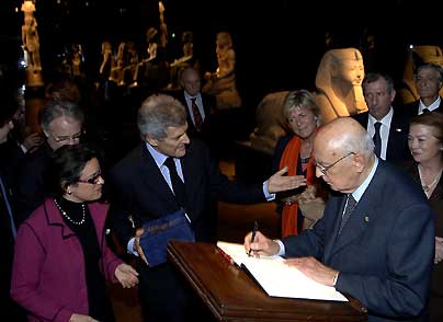 Il Presidente Giorgio Napolitano con la moglie Clio e Alain Elkan, al termine della visita al Museo Egizio.