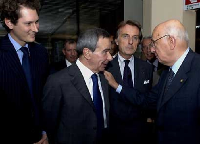 Il Presidente Giorgio Napolitano con Giulio Anselmi, John Elkan e Luca Cordero di Montezemolo, durante la visita alla sede de "La Stampa".
