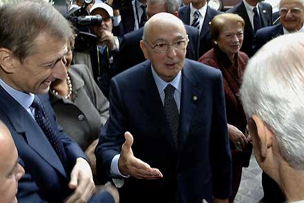 Il Presidente Giorgio Napolitano con la moglie Clio, nella foto con Piero Fassino, Segretario dei DS, all'arrivo al Campus ITCILO/ONU.