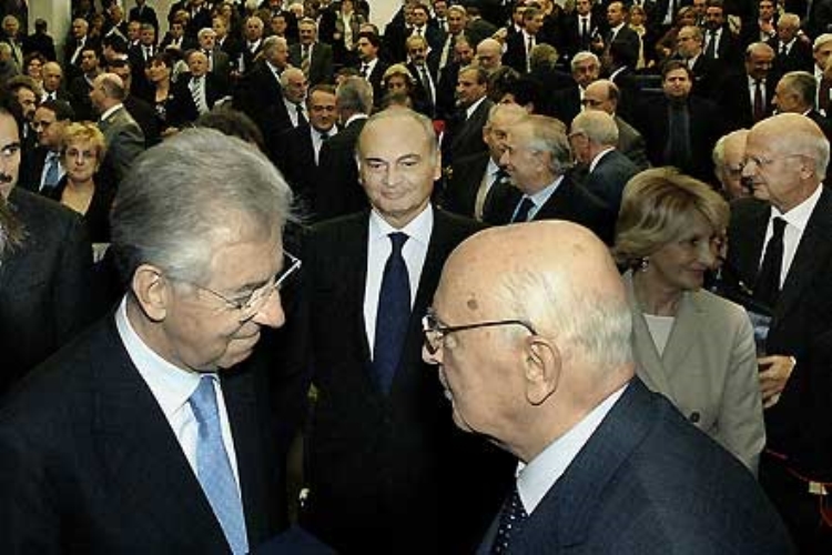 Il Presidente Giorgio Napolitano con Mario Monti, Presidente dell'Università "Luigi Bocconi" al termine della cerimonia di inaugurazione dell'Anno Accademico