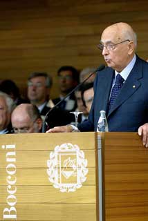 Il Presidente Giorgio Napolitano durante il suo intervento all'Università "Luigi Bocconi" in occasione della cerimonia di inaugurazione dell'Anno Accademico
