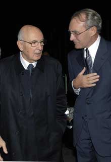 Il Presidente Giorgio Napolitano accolto dal Presidente dell'Istituto Yves Mény all'arrivo